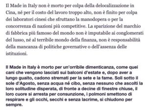 Nella newsletter di oggi Andrea spiega perché il Made in Italy è morto e lo fa senza rifugiarsi nei soliti alibi. Niente “è colpa dei cinesi”, niente “i giovani non hanno voglia di lavorare”. Ci riporta al nocciolo della questione e dice con grande chiarezza che è l’imprenditoria italiana ad essersi seduta, ad avere rinunciato al proprio ruolo e forse anche al proprio sogno in favore della comodità.